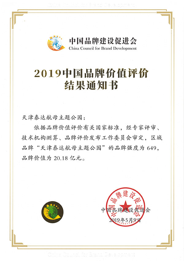 2019年5月9日,經中國品牌建設促進會依據品牌價值評價有關國家標準經專家評審、技術機構測算、品牌評價發布工作委員會審定,“天津泰達航母主題公園”區域品牌價值為20.18億元。