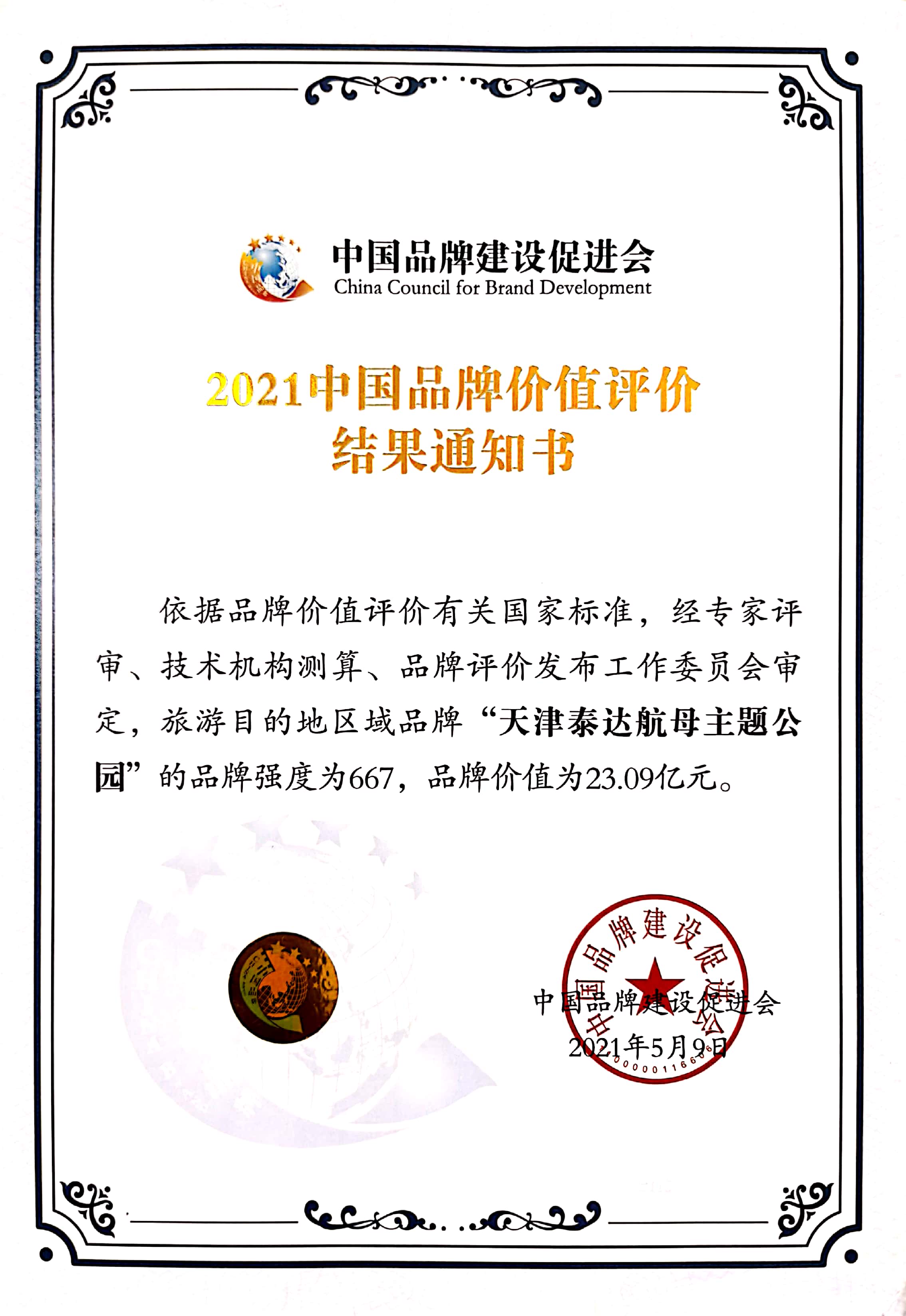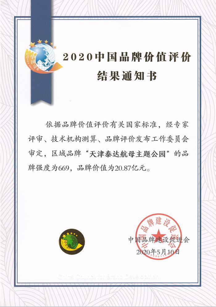 2020年5月10日,經中國品牌建設促進會依據品牌價值評價有關國家標準,經專家評審、技術機構測算、品牌評價發布工作委員會審定,‘天津泰達航母主題公園’ 區域品牌價值為 20.87 億元