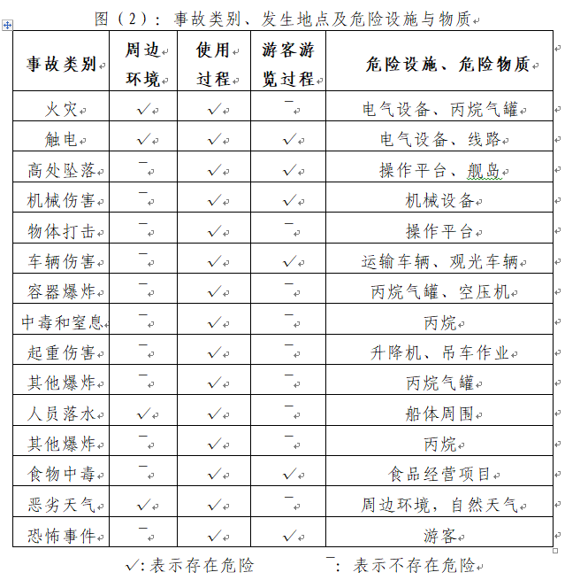 根據泰達航母現場環境、經營內容、使用設備設施,在泰達航母范圍內可能發生的事故類型,可能會發生事故的地點及導致發生事故的危險設施、危險物質。具體包含火災、觸電、高處墜落、機械傷害、物體打擊、車輛傷害、容器爆炸、中毒和窒息、人員落水、起重傷害及其他傷害,具體內容見圖(2)。