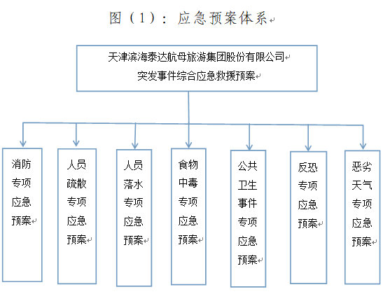 4.本預案上級預案為《濱海新區旅游生產安全事故綜合應急預案》及《泰達控股生產安全事故綜合應急預案》,下級預案由《消防專項應急預案》?《人員疏散專項應急預案》?《人員落水專項應急預案》?《食物中毒專項應急預案》、《惡劣天氣專項應急預案》、《反恐專項應急預案》、《公共衛生事件專項應急預案》和各項現場處置方案組成,是泰達航母旅游生產安全事故應急救援綜合預案的具體專項救援方案,具體見圖(1)。